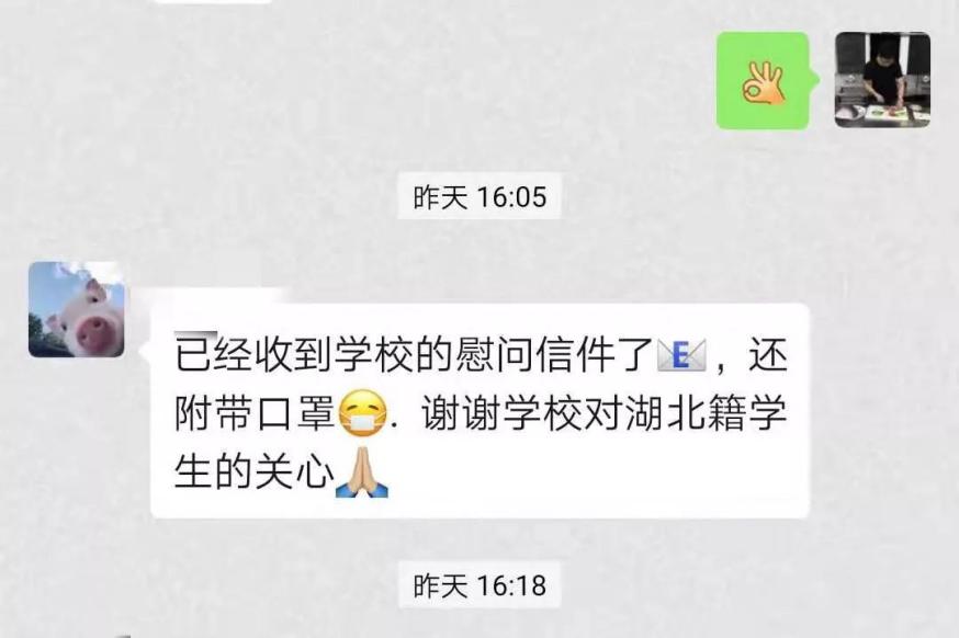 学院也时刻牵挂着疫区的学生们,第一时间联系湖北籍学子,关心他们的健康和困难,组建湖北学子微信、QQ群,每日了解他们及他们家人的身体状况,嘘寒问暖,无微不至!