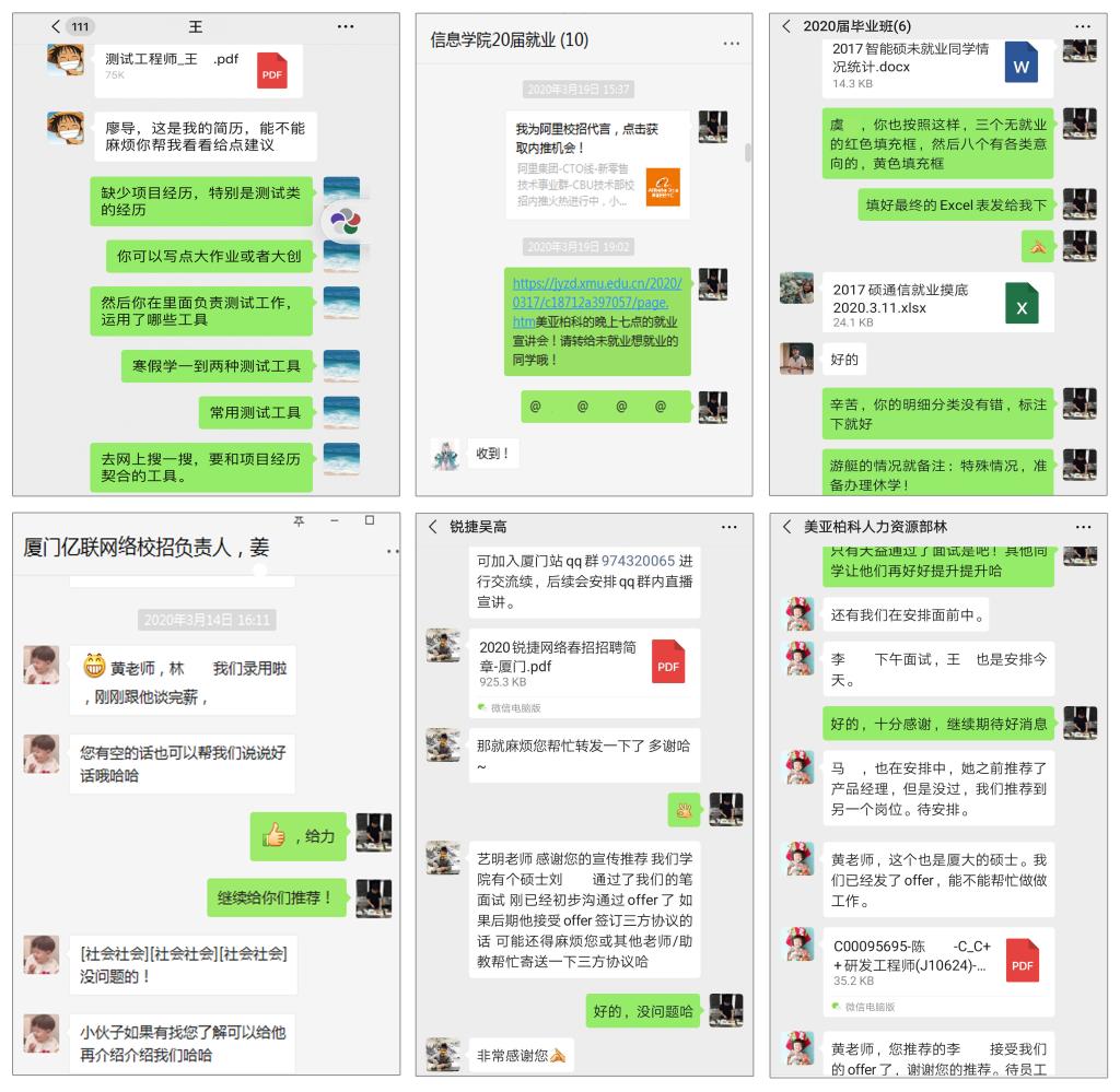 “耐心加强云指导”,学院积极搭建就业信息服务平台,邀请各用人单位入群,不断完善以“厦大就业”微信公众号、学院“厦信青年”微信公众号、毕业生QQ群、微信群为主渠道的校、院两级信息瞬时传递机制,同时积极宣传学校就业网提供的各种就业指导和服务项目。毕业生辅导员充分运用各类资源,主动向毕业生发送招聘岗位信息、招聘网站、简历撰写、面试技巧等信息和内容,引导毕业生认清今年国内经济形势和就业大趋势,发挥主动性,积极参加网上招聘会和投递简历。