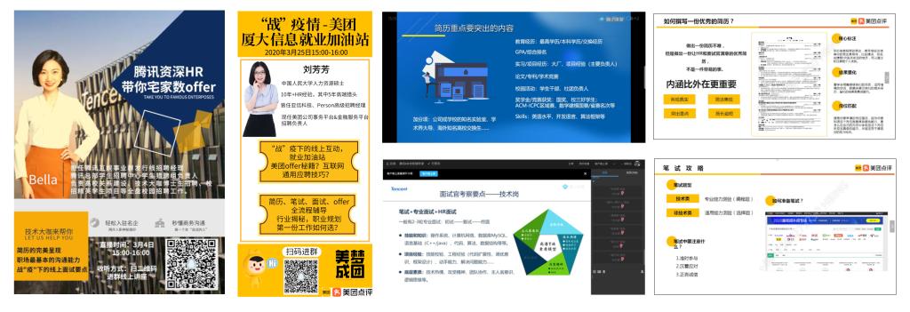 疫情以来,面对全面线上化的春招季,学院主动邀请了知名企业的资深HR协同开展线上求职分享活动。深圳市腾讯计算机系统有限公司总部学生招聘中心学生猎聘组负责人Bella于3月4日开展了一场主题为“腾讯资深HR带你宅家数offer”的云指导讲座;北京三快在线科技有限公司的具有10年+HR经验的招聘负责人刘芳芳于3月20日进行了一场主题为“战疫情——美团厦门大学信息学院就业加油站”的云指导讲座。两场活动均以线上直播讲座的形式,共吸引了近300名同学的参与,帮助广大毕业生从企业角度解析当前情况下同学们的择业就业问题,为同学们提供疫情期间的求职干货,尤其是简历制作及网络面试的技巧,大大提升了同学们求职面试的信心。于此同时,两家企业也给学院带来了近100个的实习岗位需求。