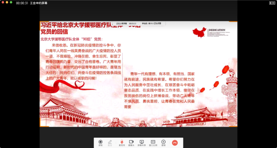 会议中,王金坤同学首先带领大家研读学习“习近平给北京大学援鄂医疗队全体‘90后’党员的回信内容,并指出自己感触颇深。其他各位党员同志围绕习主席的回信,结合自身学习和工作实际进行了细致详实、深入浅出的分享。支部宣传委员蔡晓海同学认为:“习近平总书记对广大青年寄予了极大的期望和鼓舞,我们要争当新一代自信青年,发扬艰苦奋斗的精神,以更加健康向上的精神面貌向着明天,为祖国发展贡献力量。”党员康珊娜同学认为:“习主席的话语重心长,言犹在耳,是对广大青年奋力夺取疫情防控和实现经济社会发展目标双胜利的极大鼓舞,也是对新时代中国青年的谆谆教诲。我们年轻一代需要树立远大理想、热爱伟大祖国、担当时代责任,承担自己的社会责任,为国家建设贡献力量。”党员阳名钢同学则说:“我们要牢记总书记对广大青年的殷切教导,担当民族复兴的伟大重任,脚踏实地做事,诚实守信做人。‘扶贫、战疫’,从我做起,从现在做起,从点滴小事做起。”······虽然感想各有不同,但是大家都表达了青年当自强,为祖奉献的热诚之情。