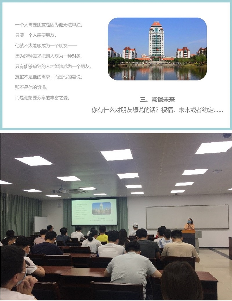 同学们仿佛在歌声中想起了昨日的自己,把宝贵的时间留给曾经感动自己的人或事。在“畅谈未来”环节中,大家分享了自己的感动和快乐,讲述了自己科研和求职的心路历程,并畅谈理想,展望未来。