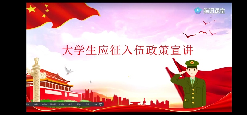 学校2020年春季征兵工作已经全面展开,开展线上宣讲会有利于同学们对国家征兵入伍政策有更深入的了解,强化大学生的国防意识,鼓励广大青年学生把参军入伍作为人生理想来追求,在最绚烂的年华里将自己的青春融入国家的强军梦中。