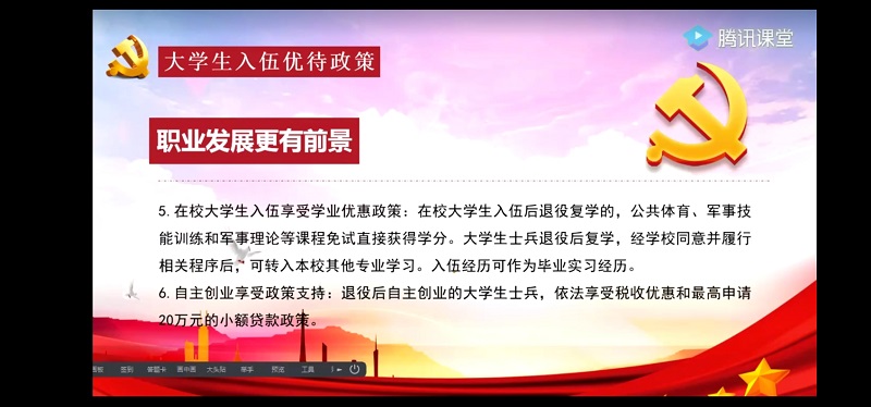 今年受疫情影响,国家一年两次征兵工作合并至下半年统一组织实施,为加大征兵宣传力度,让同学们更清楚地了解国家最新征兵入伍政策,落实好2020年大学生征兵工作,信息学院于7月8日晚在线上召开了大学生应征入伍政策宣讲。宣讲会由学院负责征兵专项工作的辅导员戴海波主讲。