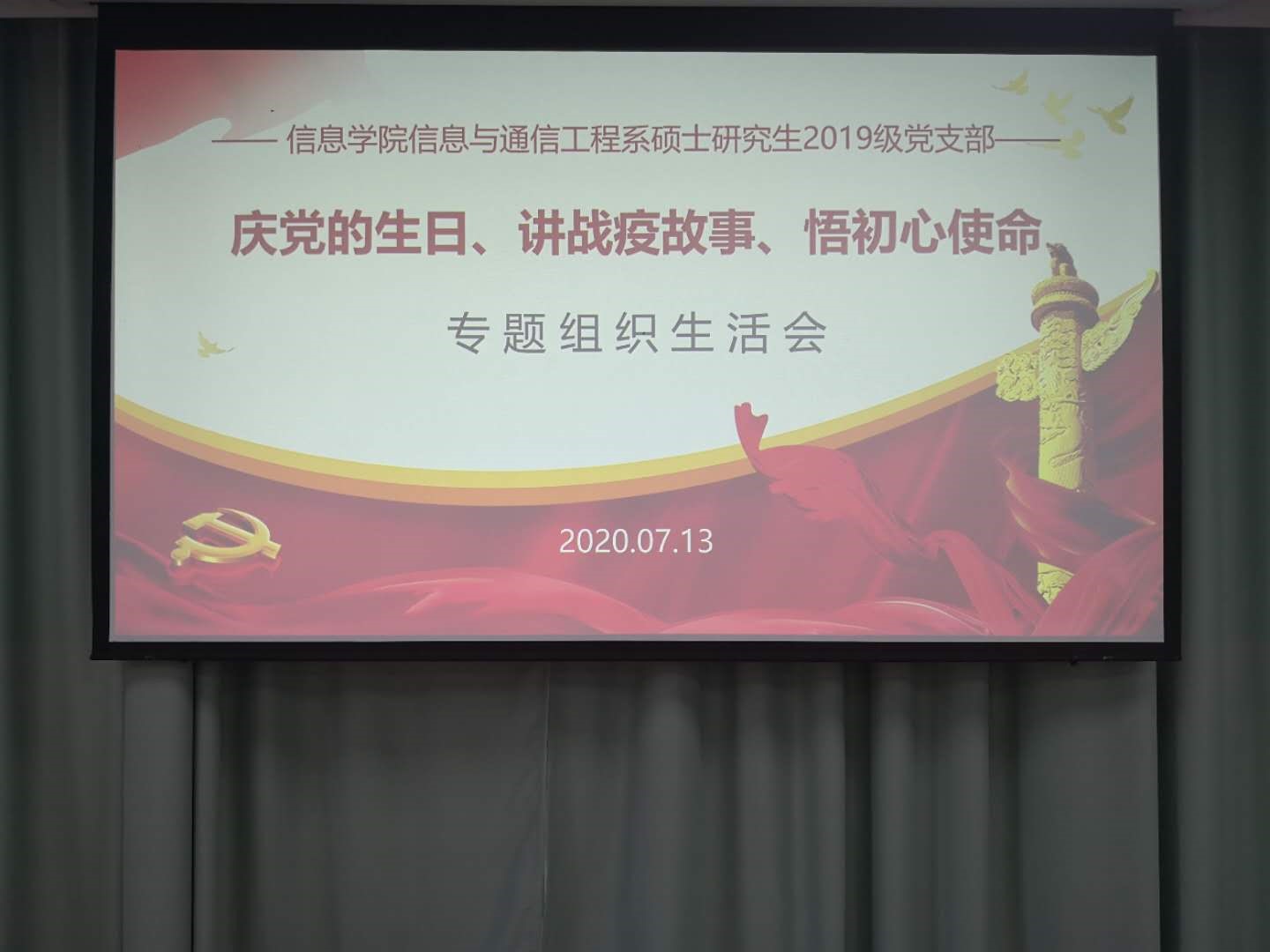 为深入贯彻落实党中央、教育部党组、校党委对于基层党组织常态化疫情防控“四个一”行动的要求。7月13日中午信息学院信息与通信工程系硕士研究生2019级党支部召开“迎党的生日、讲战役故事、悟初心使命”主题组织生活会,会议由党支部副书记王健铮同志主持。