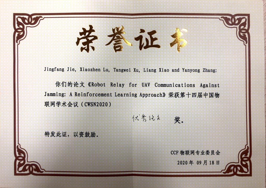 2020年9月18日,由我院肖亮教授指导的研究生揭晶方、卢晓珍和徐堂炜同学,与中科大张燕咏教授合作完成的论文“Robot relay for UAV communications against jamming: A reinforcement learning approach”(机器人中继辅助无人机通信抗干扰:基于强化学习的方法)获得第十四届中国物联网学术会议优秀论文奖。