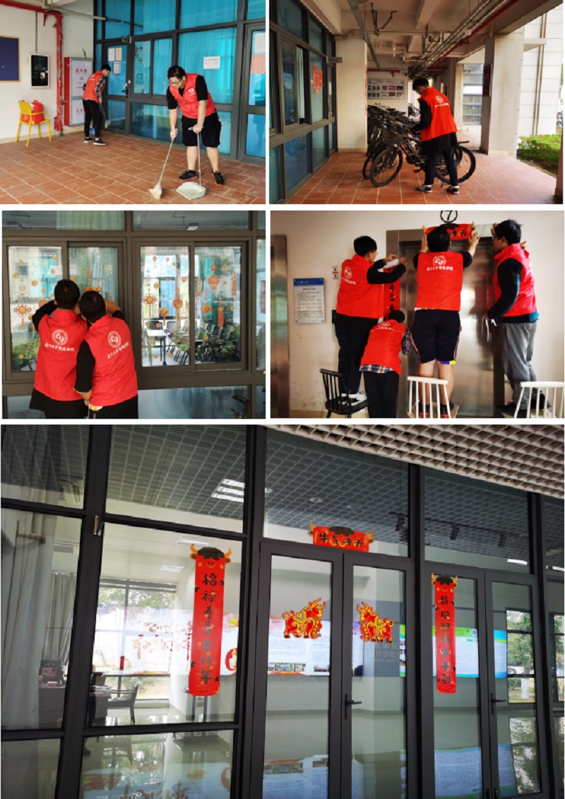 在翔安校区,留校的9名同学们也组成了志愿者分队,对全部楼道都进行了清扫,对杂乱停放的自行车停放区域进行了整理,对“一站式”学生共享空间和学生活动中心办公点也进行了整理以及新春氛围布置。