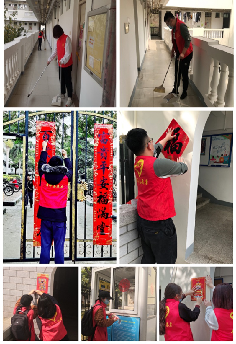 为了全面落实“四史”教育,传承和弘扬中华民族优秀传统文化,深入挖掘传统节日的文化底蕴和时代精神,信息学院结合常态化疫情防控的总体要求,于2021年1月28日上午在思明校区海韵学生公寓、翔安校区映雪、国光、芙蓉宿舍园区各楼栋,以及“一站式”党团活动室举办了除“陈”布新和新春氛围装饰志愿服务活动。