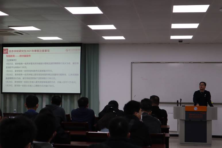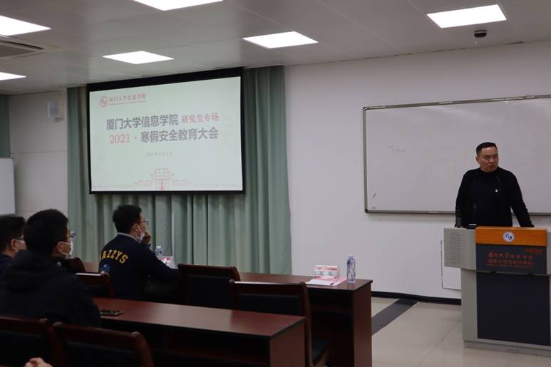 2021年2月1日上午9时,信息学院在海韵行政楼A201召开了研究生寒假安全教育大会。院党委书记刘弢、副院长姚俊峰、院党委副书记龙坚毅、院团委副书记黄艺明、辅导员蔡婧蓉,学院寒假全程留校研究生及主要学生干部参加大会。大会由刘弢书记主持。