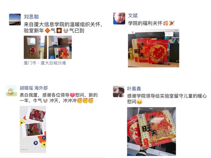 会后,学院还组织慰问了留校坚守实验室的老师和同学们,为每一间实验室送去“福”字门贴和新春大礼包,鼓励他们认真科研、做学问,同时也送去新春的祝福和关怀,师生纷纷表示欢喜和感动!