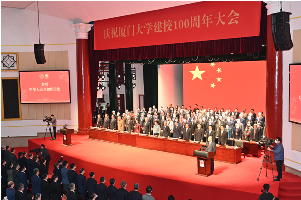 大会在庄严的国歌声中开始。庆祝大会由校党委书记张彦主持。教育部党组书记、部长陈宝生首先宣读了习近平总书记贺信并致辞。习近平总书记在贺信中充分肯定了厦门大学百年来的办学成就,对学校未来发展寄予殷切期望。陈宝生部长对厦门大学建校100周年表示热烈祝贺,并就学校深入学习贯彻习近平总书记贺信精神提出要求。校长张荣作题为《建世界之大学 为吾国放异彩》的致辞,指出立足新时代,面向新百年,厦门大学必须以更高远的历史站位、以更深邃的战略眼光,从中国的伟大实践中汲取前行的力量。福建省委领导、厦门市委领导、兄弟高校代表、境外友好高校代表、陈嘉庚先生后裔、教师代表、校友代表、学生代表纷纷致辞。大会还进行了“厦门大学南强杰出贡献奖章”颁授仪式。