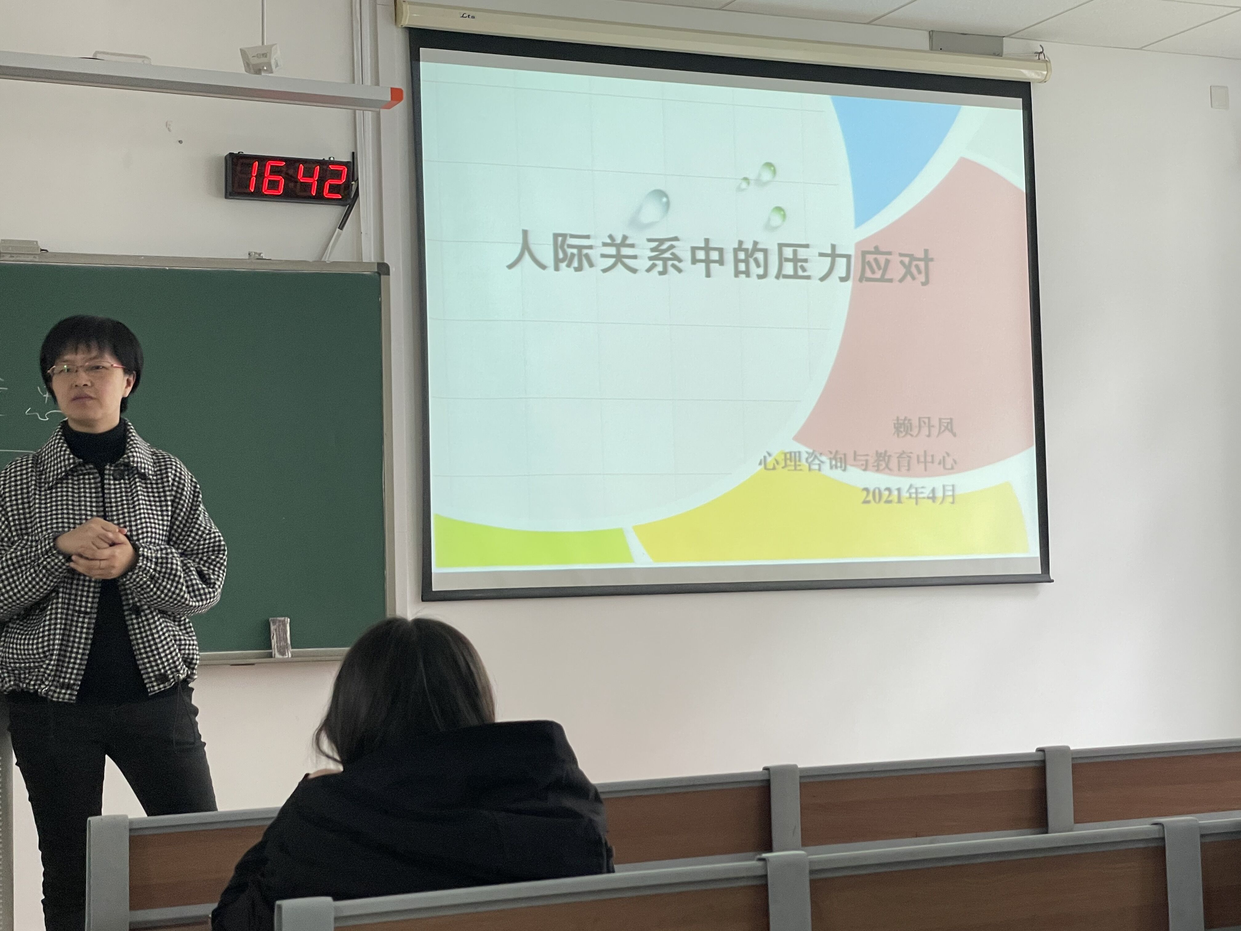 4月19日下午,信息学院2019级、2020级全体学生干部在翔安校区学武楼C107教室进行学生干部心理教育,学校心理咨询与教育中心赖丹凤老师主讲《人际关系中的压力应对》主题心理讲座。