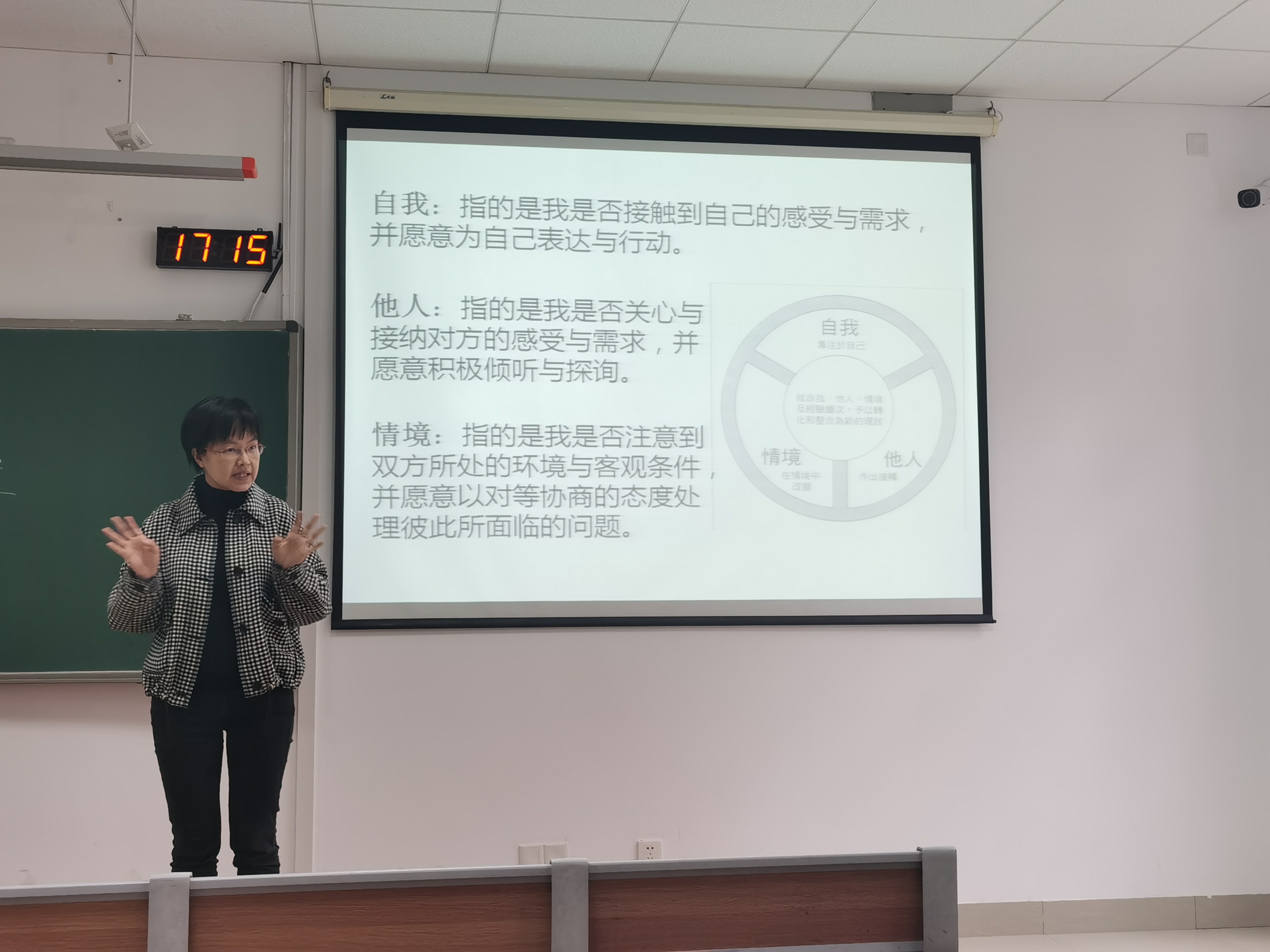 分析完四种不正确的类型后,赖老师引出了一种更为恰当的人际交往中的表达类型——一致型。赖老师以生动的例子介绍了一致性的人是如何与人交流的,他们首先以“我”为主语叙述客观事实,紧跟自己的感受,再说明自己的要求或询问对方建议。因此,一致性的人能较好处理自己、他人以及情境三者之间的关系,是人际关系中较为理想的表达方式。