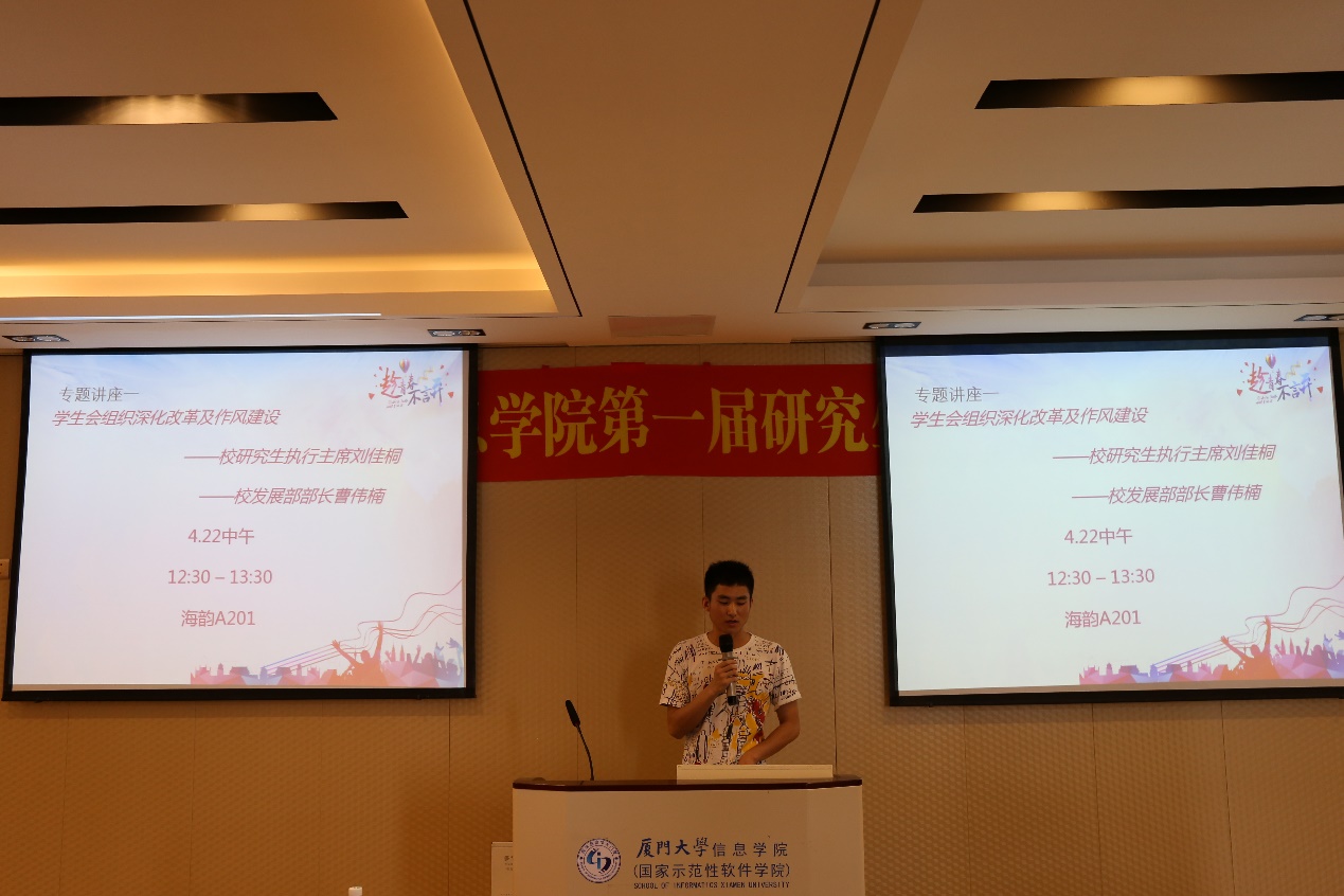 最后,学院研究生团总支书记郭志华对此次骨干培训班的安排做出了详细的介绍。此次骨干培训班由主题讲座、海韵学术文化节和主题演讲比赛为主线来考察学员们的综合素养。