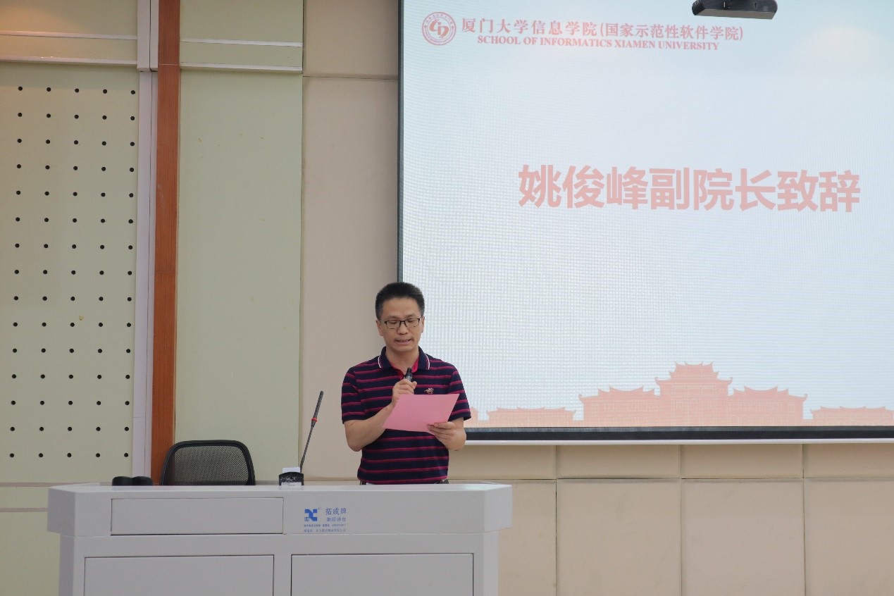 然后,姚俊峰副院长上台致开幕辞。姚俊峰副院长对已举办的十届海韵学术文化节给予了充分的肯定。他表示,该活动始终秉承“自强不息、止于至善”的校训,已成为一个以学生为中心,聚焦学术前沿、促进学术交流的良好平台。随后,他回顾了习近平总书记致厦门大学建校100周年的贺信内容,勉励信息学子努力学习先进科学知识,勤学苦练真本领,掌握专业技能,增强创新能力,为推进世界一流大学建设,推动我国信息技术的创新发展,实现中华民族伟大复兴的中国梦而努力奋斗。