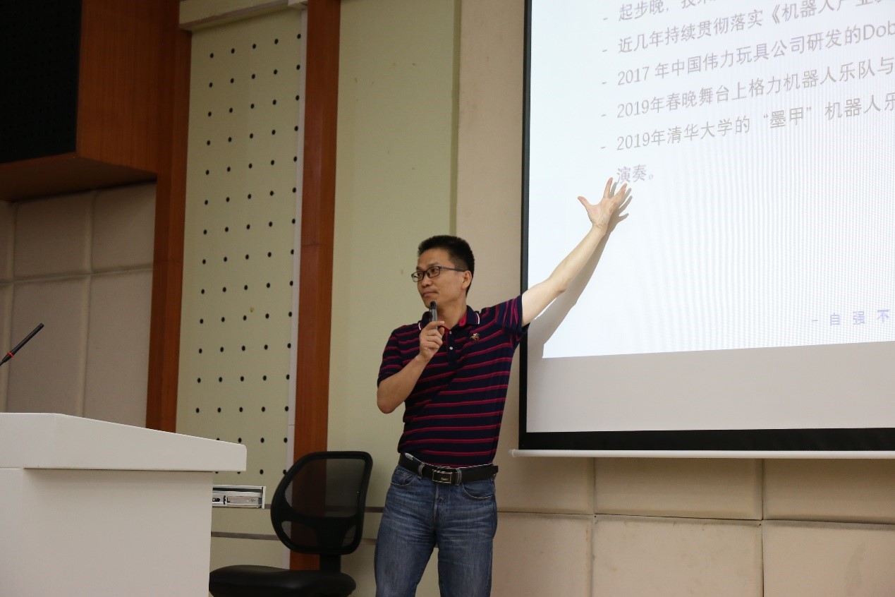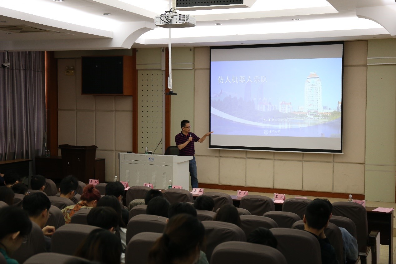 开幕式结束后,信息学院副院长姚俊峰教授为同学们主讲了以“仿人机器人乐队”为题的首场名师讲座。姚俊峰教授首先通过具体事例阐述了本课题研究的创意来源和团队背景。他提到,仿人机器人乐队具有自动智能识谱和即兴演奏功能,可实现兼具高稳定性、高精准性和观赏性的演奏。在讲座中,姚俊峰教授通过视频短片展示了仿人机器人乐队的演奏效果,并从国内外技术发展现状、关键技术问题与路线、机器人本体硬件与软件规格等多个角度讲述了仿人机器人乐队的项目内容和项目进展。在讲座的最后,姚俊峰教授希望大家都能在自己感兴趣的领域深耕,与专家团队共同合作,在今后的研究和学习中钻坚研微、收获累累硕果。