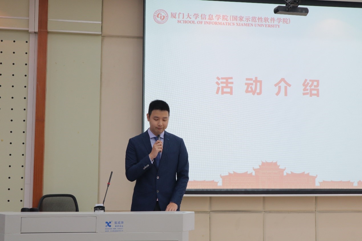 紧接着,信息学院研究生会执行主席王健铮同学介绍了第十一届海韵学术文化节的活动内容。本届海韵学术文化节由学术交流、实践竞赛与文体就业三个部分组成。其中,学术交流部分主要包括海韵名师讲坛、优秀论文评选等,实践竞赛部分主要包括第十五届京信杯“无线改变生活”创意设计大赛和中国人工智能创新大赛暨厦门大学校级选拔赛两场专业赛事活动,文体就业部分则由简历制作大赛以及一系列户外活动组成。