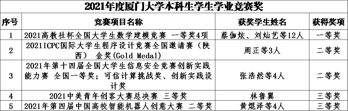 信息学院过去一年的科创工作得到学校的高度认可,获得厦门大学2021年度本科生科创竞赛工作先进集体。高级工程师冯超获得优秀指导教师,团委副书记黄艺明获得科创竞赛工作先进个人。
