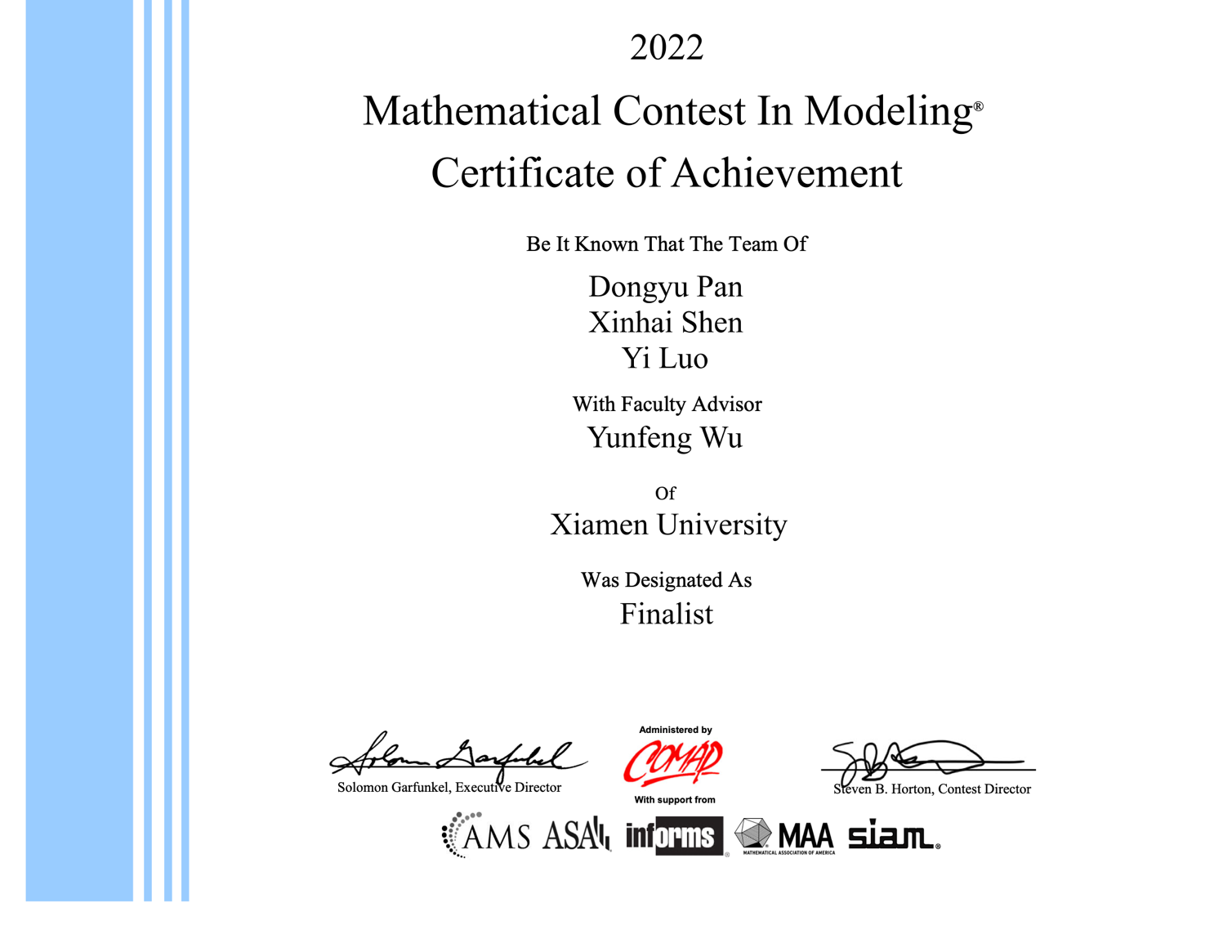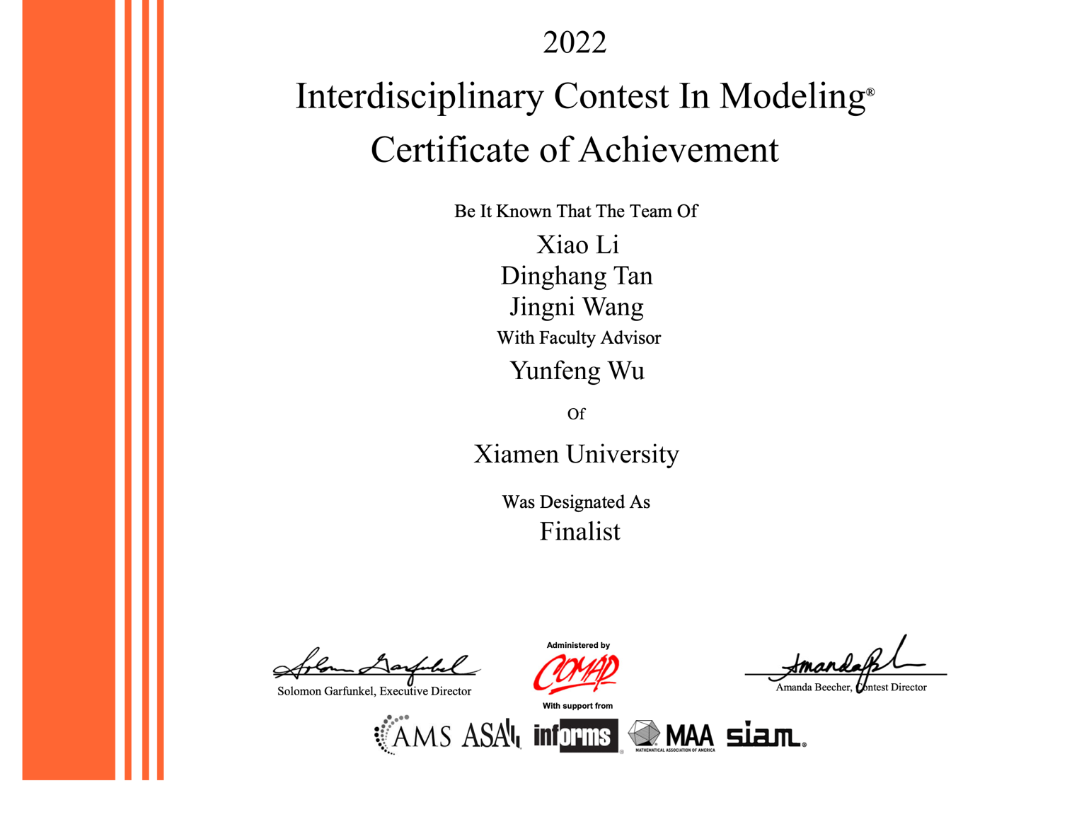 美国大学生数学建模竞赛是由美国数学及其应用联合会(COMAP)主办,由美国MAA、SIAM、INFORMS、ASA、AMS等学术组织资助的国际性本科生学业竞赛。该项赛事于每年2月举办,赛程为4天。每只参赛队由至多3名本科生组队,比赛中各队选择数学建模(MCM)和交叉学科建模(ICM)共6道赛题中的任意一题,按题目要求完成数学建模、编程求解和论文撰写等工作。