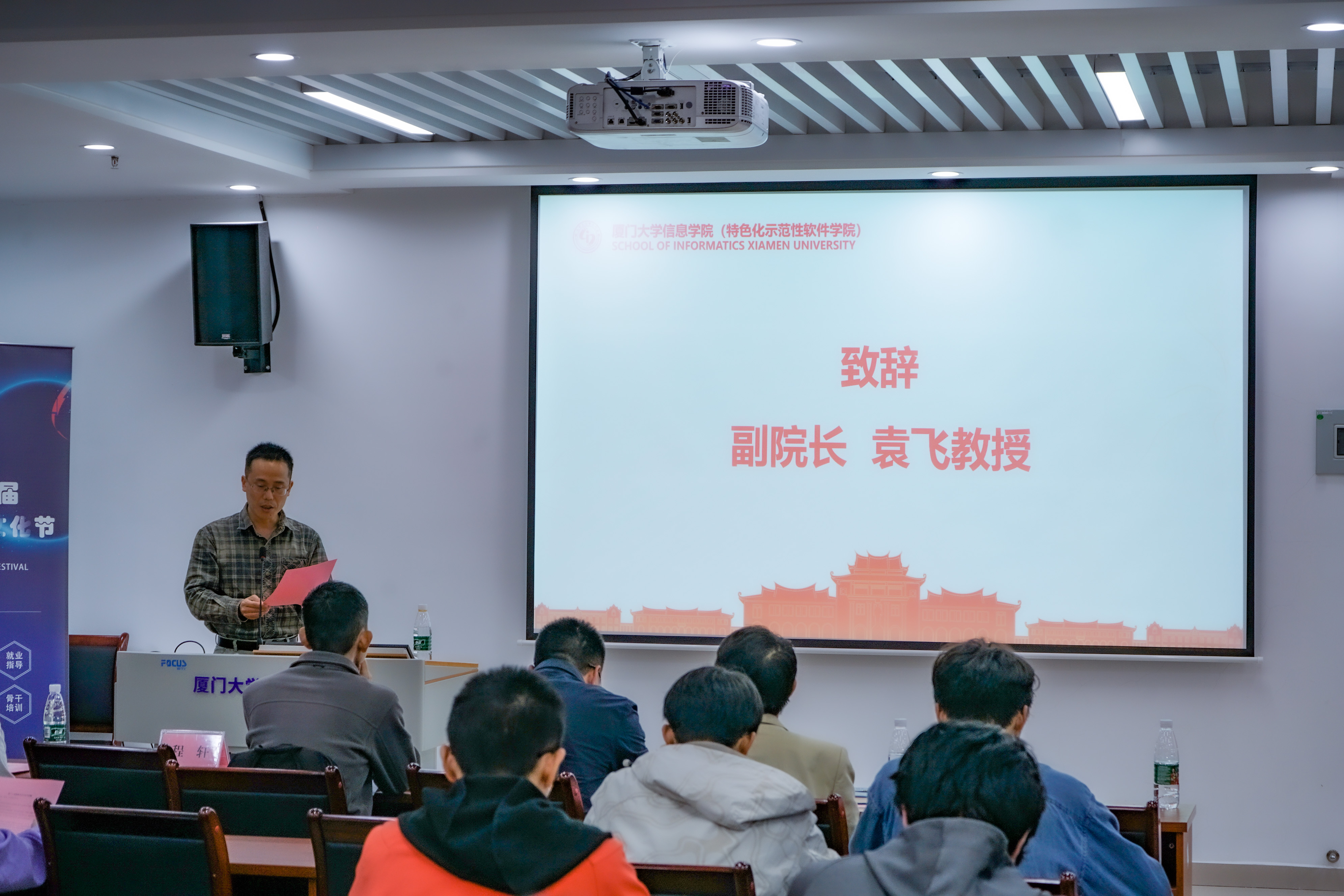 副院长袁飞教授致开幕词。他介绍了过去一年学院在各方面取得的优异成绩,指出海韵学术文化节经过十三年的发展,已成为贴近学生成长成才需求,具有学院学科特色,并在全校范围内有影响力的品牌学术文化活动。他强调,举办海韵学术文化节目的是促进师生间的学术交流,加强学生科研训练、创新创业教育、就业指导和综合能力培育,提升学生团队协作能力、组织策划能力和沟通表达能力,促进学生全方位成长。最后,袁飞教授预祝活动圆满成功,希望同学们能够以饱满的热情、积极的态度投身海韵学术文化节各项活动,结识朋友,收获成长。