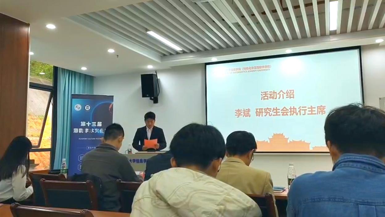 研究生会执行主席李斌以视频方式回顾往届活动的精彩片段,并详细介绍本届海韵学术文化节的主要内容。他指出本届活动将涵盖学术、科研竞赛、就业指导和学生综合素质培养四大板块,将举办名师讲坛、学科竞赛、就业指导讲座、企业参访、学生骨干培训等丰富多彩的活动,鼓励同学们积极参与,共同创造一个精彩纷呈的学术文化盛宴。