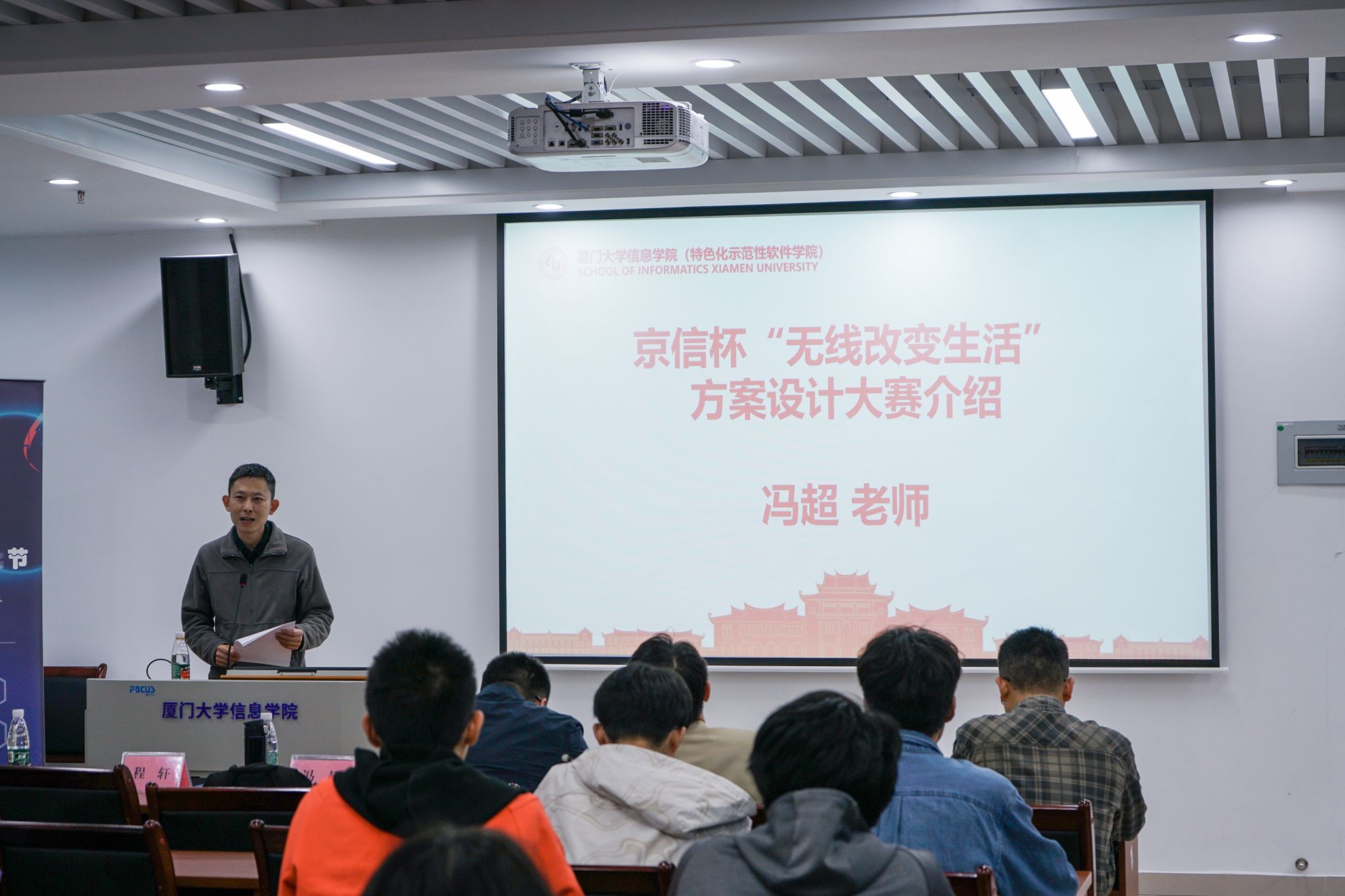 冯超老师为大家介绍了第十七届京信杯“无线改变生活”方案设计大赛。他强调了无线通信技术在当今社会的重要性,鼓励同学们充分发挥创意,运用专业技能知识,以未来宽带无线通信为背景,提出各种移动互联网应用方案或有依据的创意和想法,希望同学们成为大赛的热心支持者和参与者。