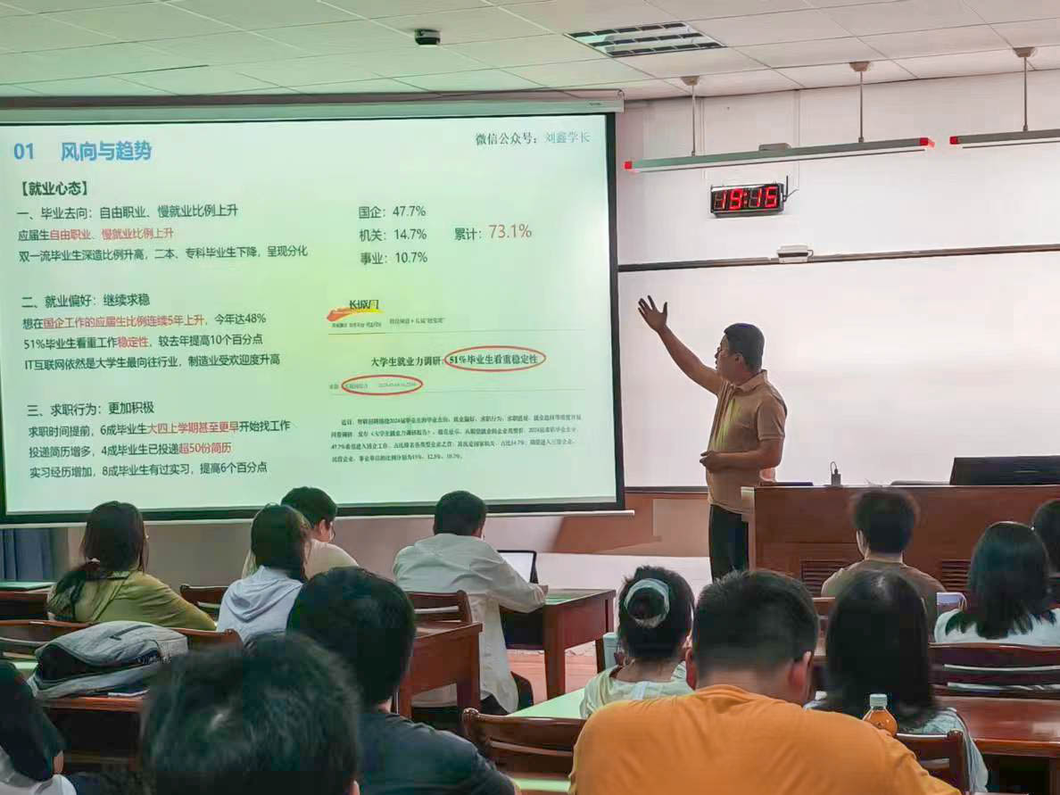 刘鑫围绕毕业生人数、就业环境、就业心态等几个方面对考公的风向趋势进行了详细解读。他指出考公是同学们晋升的一条路径,鼓励同学们不要轻易放弃,考公的趋势目前还是处于一个较为平稳的状态。