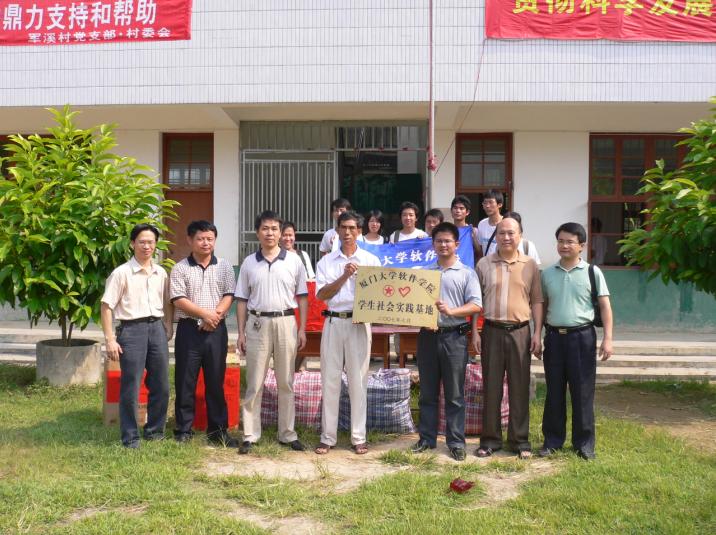 8月2日上午,“软件学院暑期社会实践队捐赠暨挂牌仪式”在军溪村小学举行,带队老师王洁松把实践队师生捐赠的一台电脑、文体用品和服装交到军溪村小学朱校长手中,今后软件学院将在军溪村设立学生社会实践基地,大力进行支教、宣传、募捐、结对帮扶等活动,建立支教扶贫的长效机制。适逢郑庆喜同志挂职期满即将离任,当地乡亲们为他举行了隆重而感人的欢送仪式,前来军溪村的我校党委组织部颜章炮部长、外文学院党委张龙海副书记和九峰镇有关领导一同参加了捐赠暨挂牌仪式。