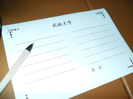 同学们在每人一张的“我的大学”备忘签上郑重写下自己四年的学习、生活的各种目标。经过刚才的活动,同学们若有所思,都写得非常用心。所有这些备忘签将会由班主任保管,等到四年后大家即将毕业的时候,再拿出来细细品位。。。