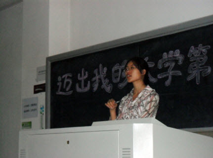 然后,班主任杨宝容以自己大学生活的亲身经历为例,介绍了自己的规划、与人相处、大学的学习以及一些值得同学们注意的事情等等,把一个完整的大学生活呈现在同学们的面前。她鼓励同学们尽早确立大学四年的目标,并且坚定不移的为之努力奋斗。通过这样的介绍,同学们对大学的学习、生活有了更加深刻的了解,也使他们了解到大学生活的第一步至关重要,一定要迈好。