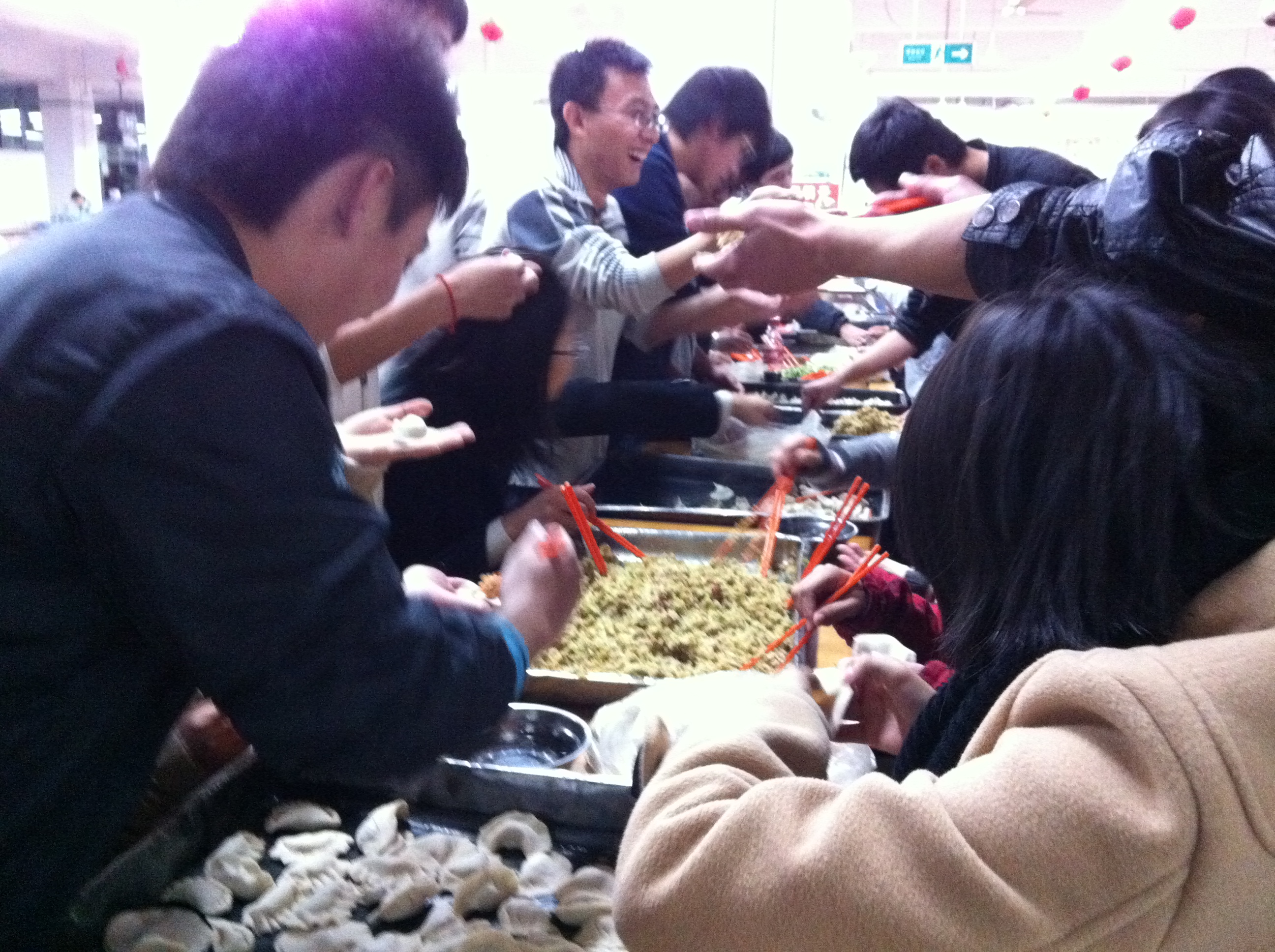 24日晚,在北区食堂工作人员的协助下,四班又开展了包饺子活动。同学们兴致勃勃,拼了5张桌子,摆了两大盘的饺子馅,只一阵子的时间,空盘子就已经摆满了形状各异作品,饺子出锅的时候,大家更是抢得激烈,吃得欢畅。