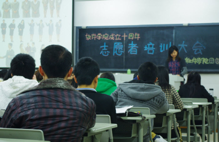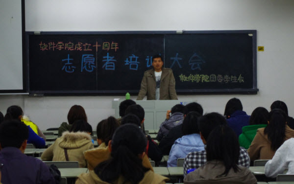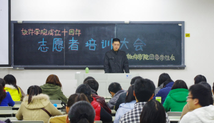 2012年3月2日晚上7点,在海韵教学楼101召开了庆祝软件学院成立十周年志愿者培训大会。出席大会的有软件学院团委副书记李加冕、李绍玉,辅导员刘茜,大会由辅导员刘茜和08级本科生陈志龑担任主讲。软件学院九十余名本科生和研究生志愿者参加了培训大会。