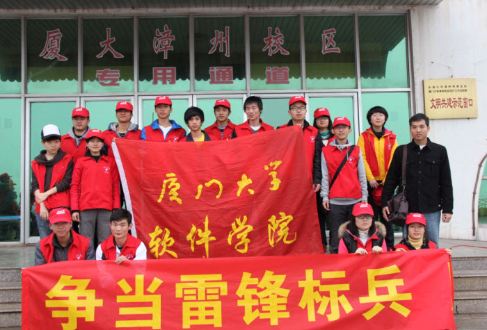 2012年3月4日上午9时,软件学院的16名学子在学院团委副书记李加冕的带领下,和来自物理与机电工程学院、人文学院、法学院的志愿者一道,高举院旗,来到漳州港开展以“争当雷锋标兵,践行志愿服务”为主题的学雷锋活动。