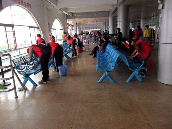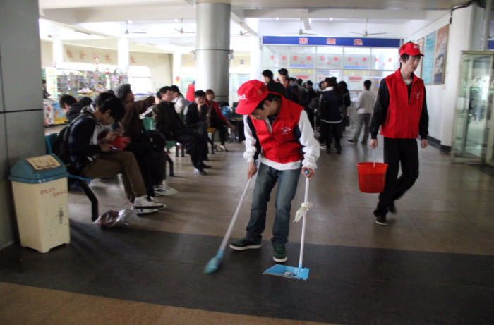 志愿者们头戴火红志愿者帽、身着红色志愿者马夹、手拿劳动工具,一身整齐鲜亮的装扮,彰显了厦大软件学院志愿者的风采。虽然当日阴雨绵绵,但志愿者的工作热情丝毫未减。一来到漳州港,志愿者们就根据之前定好的分工,热火朝天地干起来。软件学院的志愿者负责漳州港候船室的卫生清理,即擦洗玻璃、桌椅,清扫室内卫生。志愿者们一个个热火朝天地忙里忙外,提水、擦玻璃、扫地、拖地、爬梯子。。。大冷天里却可以明显看到志愿者脸颊一串串的汗珠,然而没有一个人喊苦喊累。“能够作为一名青年志愿者参与活动,这是非常有价值和意义的一件事,令人感到非常骄傲!”朴实的一句话却代表了所有青年志愿者的心声。在志愿者们一上午的辛勤工作后,漳州港面貌焕然一新了。
