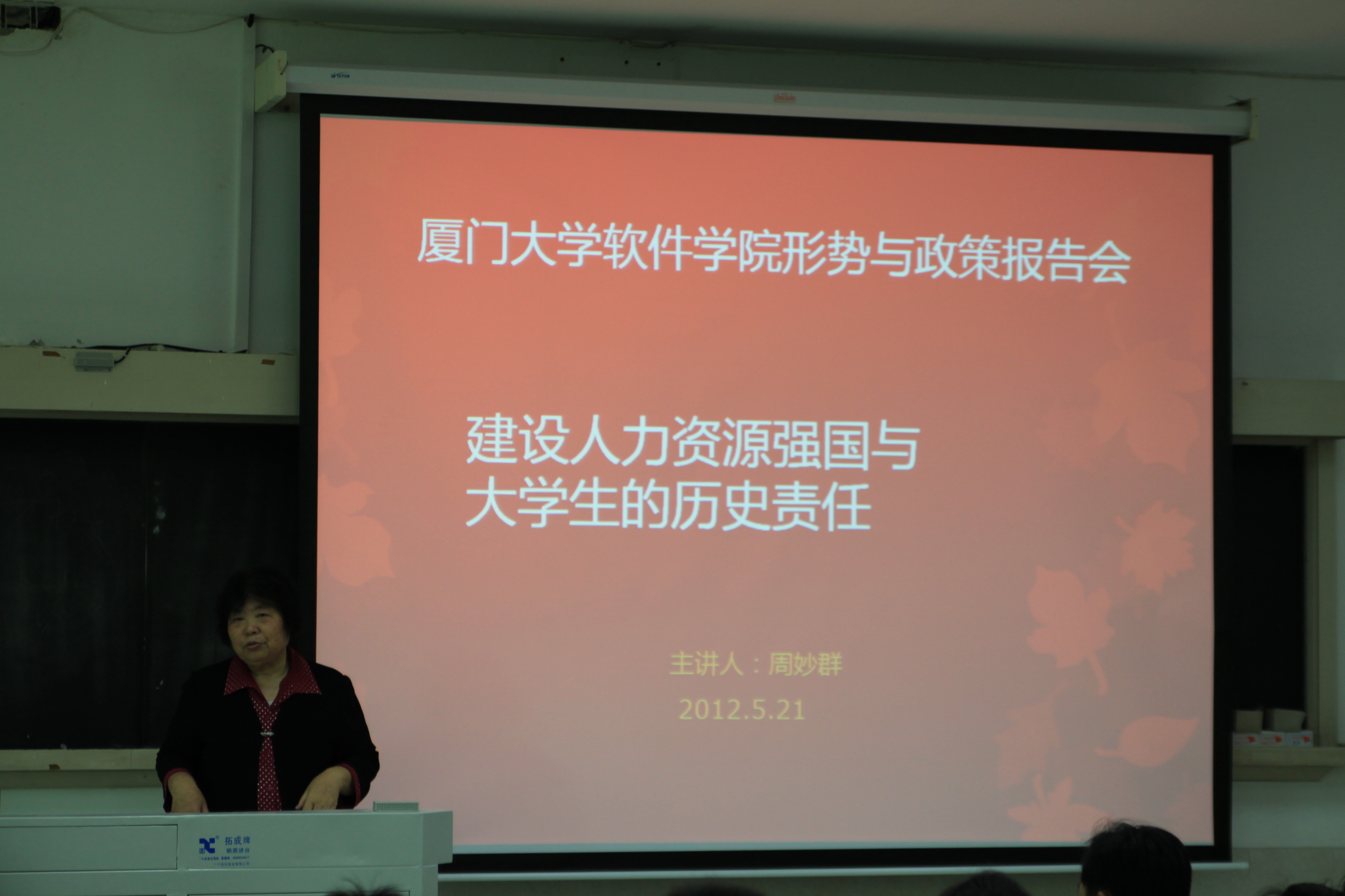 5月21日下午,由厦门大学经济学院资深理论报告员周妙群教授主讲的题为“建设人力资源强国与大学生的历史责任”形势与政策报告会在公寓201教室隆重举行,报告会由软件学院党委副书记刘钟南老师主持。软件学院党委书记杨敬达老师、辅导员刘锦锗老师同全体同学一起参加了学习。