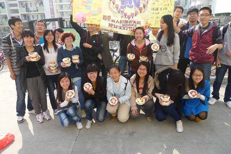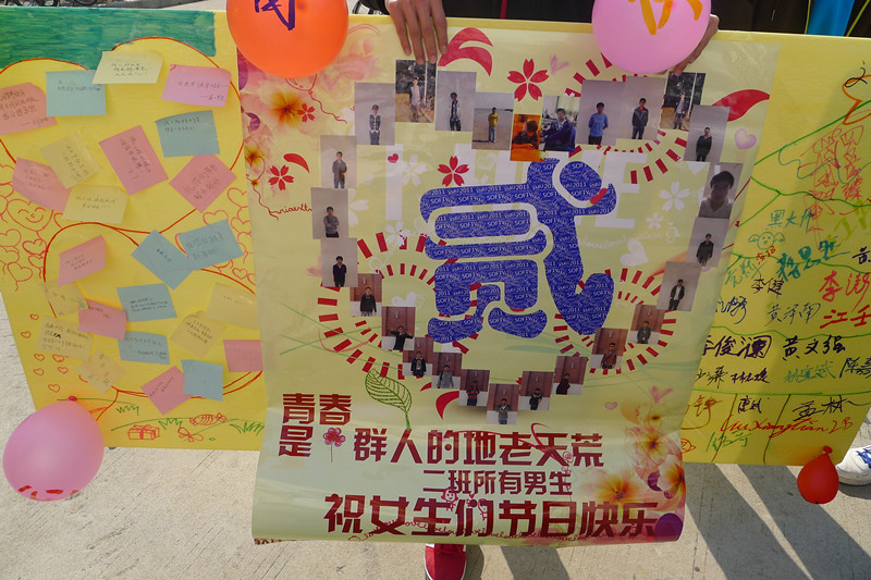 早上9点,男生们一起来到女生宿舍楼下,将准备好的小蛋糕整齐地摆成一个爱心。随后,大家在班长的带领下向楼上的女生们高声祝福。女生们听到了男生的呼喊,纷纷下楼表示感谢。宿舍楼下顿时欢声一片。见到女生来到跟前,男生们迫不及待地将蛋糕递给女生。细心的话会发现,每个小蛋糕上面都写有一个2班女生的名字。男生们希望通过这种方式让每个女生得到独一无二的关怀。女生们收下蛋糕,年轻的脸庞上洋溢着快乐和幸福。紧接着,班长刘盼将精心准备好的庆祝海报张贴在宿舍楼宣传栏上。海报上贴着男生们的美好祝愿,凝聚了2班全体男生的智慧和汗水,具有别样的意义。女生们看着海报上真挚的祝福语,感动之情溢于言表。活动的最后,全班同学在阳光下合影留念。