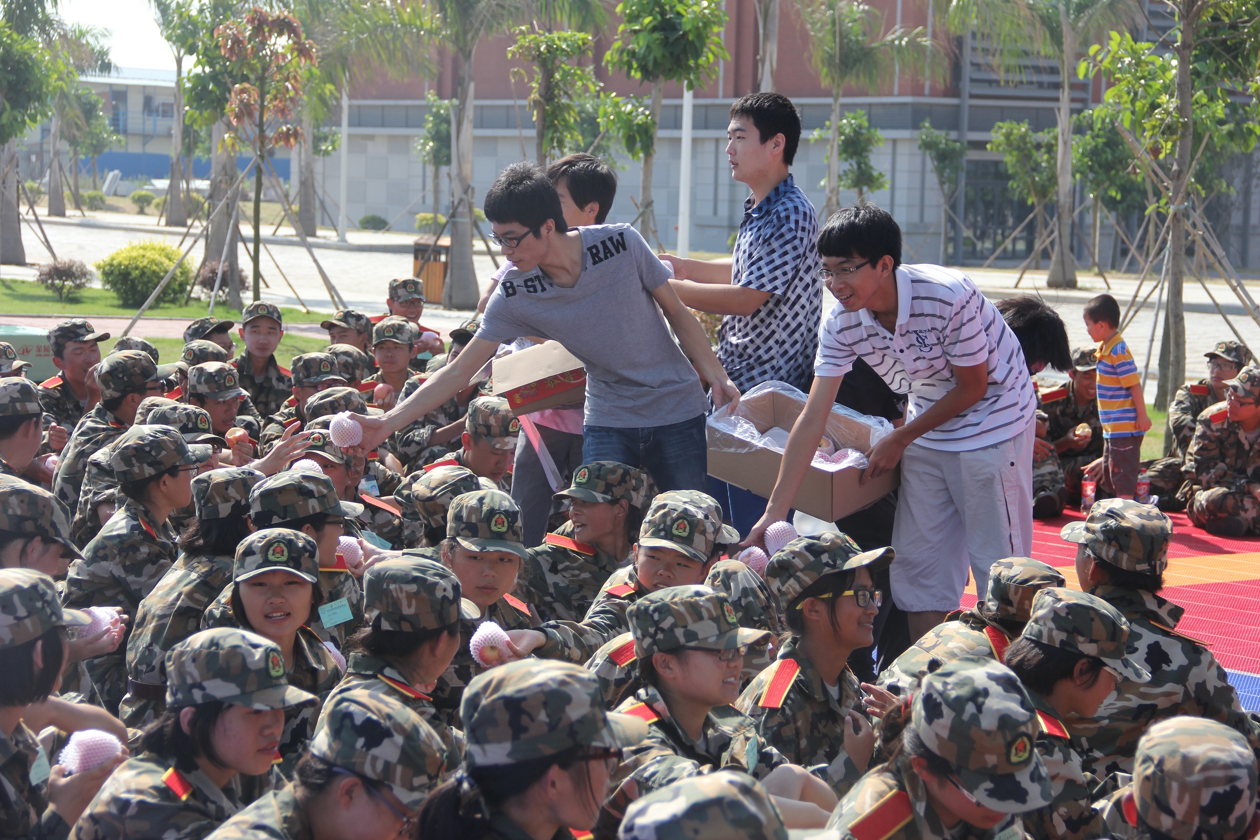 虽然正值酷暑,烈日当头,骄阳似火,但是软件学院正在军训的新生丝毫不惧酷热天气,训练严谨有序,展示出积极向上的良好风貌,得到老师与学生会干部的一致称赞。训练休息期间,老师和学生干部们关切地问候新生,向他们了解军训情况,互相交流军训经验,并为他们加油鼓气。随后,学生干部们给军训新生逐一送上事先准备好的饮料和香甜的红苹果,新生们则通过热烈的欢呼声表达了他们的开心和幸福之情。