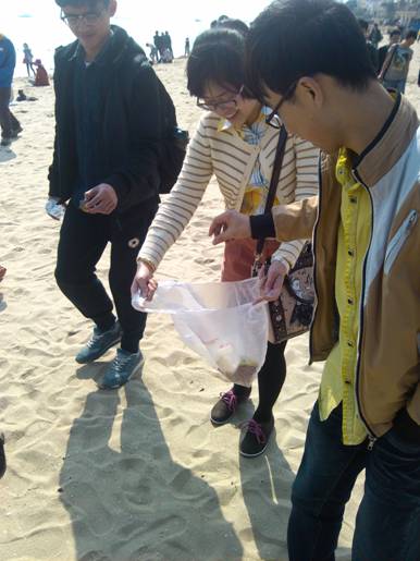 由于是周末,海边的游客十分多,在清理垃圾的过程中,不时有游人从志愿者们的身边走过,有的行人驻足微笑地看着志愿者们忙碌,有的行人教育随行的小孩要向志愿者们学习,不可以随地乱扔垃圾。最令人欣喜的是,在志愿者们实际行动的感召下,吸引了过往的一些行人也加入到志愿者的行列中来。