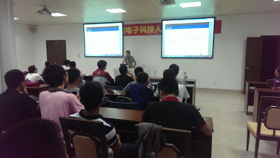 在主持人的简单介绍下,伴随着经久不衰的掌声,林献武老师登上了讲台,开始分享他关于Matlab的使用技巧。林老师以其多年以来的教学经验,并辅以理论与实际操作相结合的授课方式,让大家体验了Matlab的实用性与技巧性。他先后介绍了Matlab 语言与其他语言的不同之处,从语法到语句再到简单程序代码等Matlab的基础内容,循序渐进地让学生接受并领会其内容,做到会使用软件并会编写程序。当讲到Matlab程序与Simulike模块相结合使用的时候,整个培训现场显得尤为安静,这是现场学生都未曾接触的领域,看同学们聚精会神的模样,仿佛此时在授课的不是老师,而是能带领他们探索未知的神奇魔法师!