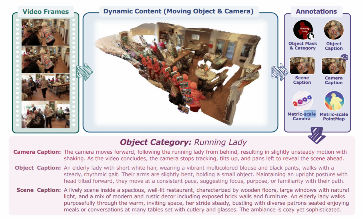 简介:理解动态物理世界——其不断演化的三维结构、真实的运动过程,以及带有文本描述的语义内容——对于实现人机交互至关重要,这也使具身智能体能够具备类似人类的能力,在真实环境中进行感知与行动。然而,现有数据集往往依赖于有限的模拟器,或是利用传统的结构-从-运动(Structure-from-Motion)方法进行尺度注释,并且在描述性字幕方面存在局限,这极大限制了基础模型从互联网单目视频中准确理解真实世界动态的能力。