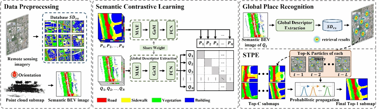 简介:激光雷达位置识别旨在在GPS信号较弱甚至拒止时,从全球坐标系下预构建的数据库中检索最接近的匹配及其位置。现有激光雷达位置识别依赖于事先采集的新鲜的三维地图,其获取和维护是耗时和昂贵的。为此,本文首次提出了一个使用高分辨率遥感影像在大规模(超过100平方公里)城市场景中进行跨视角、跨模态激光雷达位置识别的框架——L2RSI。L2RSI通过语义对比学习网络将激光雷达点云鸟瞰图和遥感子图统一到一个共享的语义空间中,克服了跨域跨视角数据的巨大差异。此外,L2RSI通过空间-时间粒子估计算法,利用多个高斯模型的混合来聚合时空信息,推断当前位置的概率密度,从而进一步提高全局位置识别的性能。