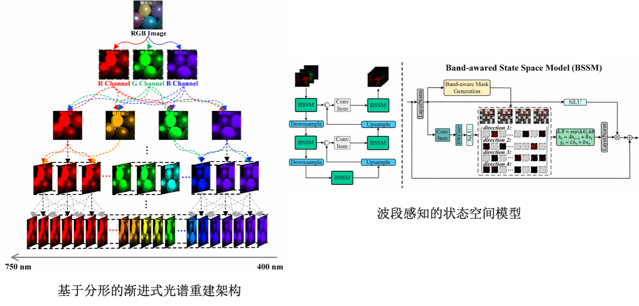 简介:通过光谱重建从 RGB 图像生成高光谱图像(HSI),能够显著降低 HSI 的获取成本。本文提出了一种基于分形的递归光谱重建网络(Fractal-Based Recursive Spectral Reconstruction Network, FRN)。与现有尝试直接在一次性操作中整合 R、G、B 三个通道的全光谱信息的范式不同,FRN 将光谱重建视为一个逐步推进的过程:既可以从宽带到窄带逐层预测,也可以采用由粗到精的方式来预测下一个波长。受数学中分形思想的启发,FRN 通过递归调用原子重建模块,建立了一种全新的光谱重建范式。在每次调用中,模型仅利用相邻波段的光谱信息,为下一个波长图像的生成提供线索,这符合光谱数据的低秩特性。此外,本文设计了一种波段感知的状态空间模型,在生成过程的不同阶段采用像素差异化的扫描策略,从而进一步抑制由反射率差异引起的低相关区域干扰。大量跨数据集的实验结果表明,FRN 在定量和定性评估中均优于当前最先进的方法,展现出更优越的重建性能。