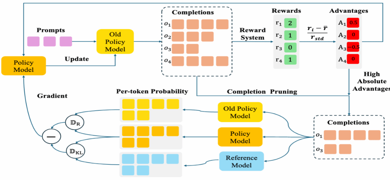 简介:本文提出 Completion Pruning Policy Optimization (CPPO),以加快 DeepSeek 提出 的 Group Relative Policy Optimization (GRPO) 算法的训练速度。本文通过对GRPO的策略目标函数进行理论推导和分析发现并非所有完成(Completion)对策略模型的梯度的贡献都相同,其贡献取决于完成的绝对优势值。基于这个发现,CPPO通过剪枝掉具有低绝对优势值的完成,大幅减少策略模型训练所需的计算量,并通过动态分配策略,有效利用完成剪枝策略释放的计算量,进一步提高GPU利用率。实验表明,CPPO在GSM8K和Math数据集上相对于GRPO算法分别实现了 8.32× 和 3.51× 的训练加速,同时保持甚至提升了策略模型精度。