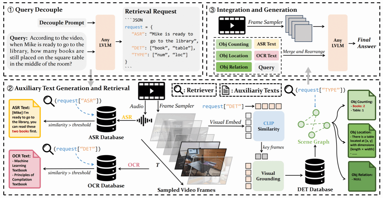 简介:不同于主流的基于长视频微调和基于Agent这类高资源需求的方案,本文提出的Video-RAG利用开源工具从纯视频数据中提取视觉对齐信息(音频、文字和物体检测)作为辅助文本,经过检索后与视频帧和问题一起以即插即用的方式整合到现有的LVLM中,节约计算资源。实验结果表明,Video-RAG在接入到主流开源模型后在三个流行的长视频评估基准中得到了大幅的性能提升。在与72B模型结合使用时,Video-RAG的性能可以超过商业闭源模型(例如GPT4o、Gemini1.5)。