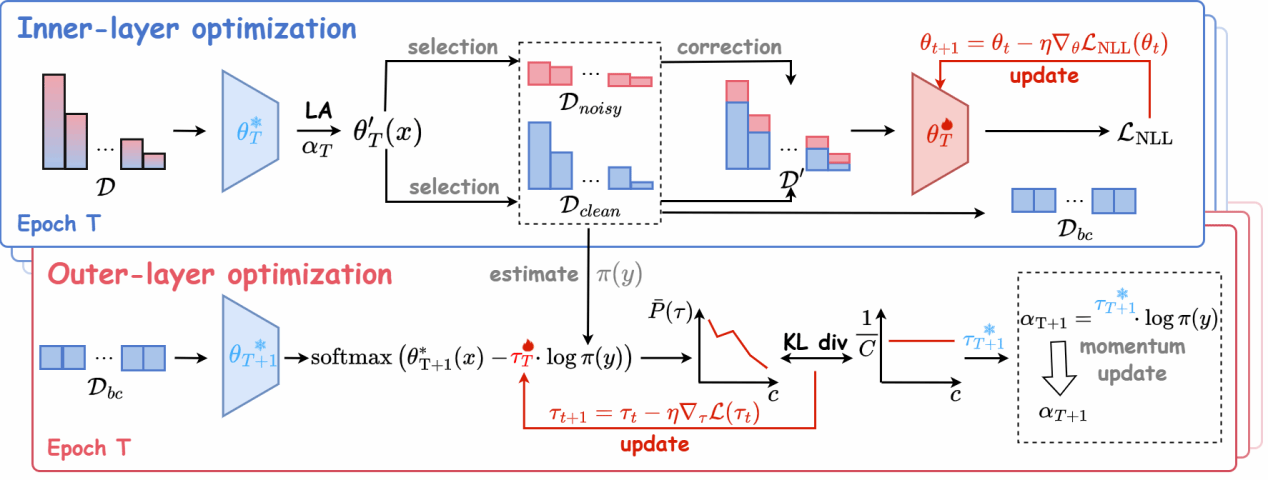 简介:长尾噪声标签学习致力于处理真实世界数据中长尾分布与标签噪声共存场景下的模型学习难题。我们发现,该场景下存在 “死锁” 困境:标签噪声学习方法需依赖无偏预测实现标签识别和修正,进而恢复真实类分布,而长尾学习方法(如logit调整)则需以真实类分布为先验,实现对模型有偏预测的矫正,二者形成循环依赖。为解耦这一死锁,本文提出双层优化框架 Unlocker:内层优化融合噪声标签方法与长尾学习方法,实现公平的噪声标签识别与修正;外层优化则通过自适应优化调整强度,动态平衡模型偏见。实验结果表明,Unlocker 在多个基准数据集上的性能均显著优于当前主流的长尾噪声标签学习方法。