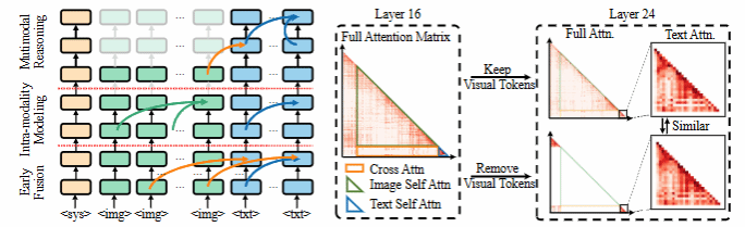 简介:本文从注意力行为的角度研究多模态大型语言模型(MLLM)的视觉冗余问题。通过大量的实证实验,我们观察并总结了MLLM的三个主要推理阶段:首先快速完成Token之间的早期融合;然后模态内建模开始发挥作用;最终,多模态推理}恢复并持续到推理结束。具体而言,我们发现,当文本标记接收到足够的图像信息时,视觉标记将停止对推理做出贡献。基于此观察,我们提出了一种提高 MLLM 效率的有效方法,称为动态视觉标记退出(DyVTE)。该方法通过判断模型所处的推理阶段,来删除所有的视觉Token,与之前的基于标记的视觉压缩方法正交但协同。