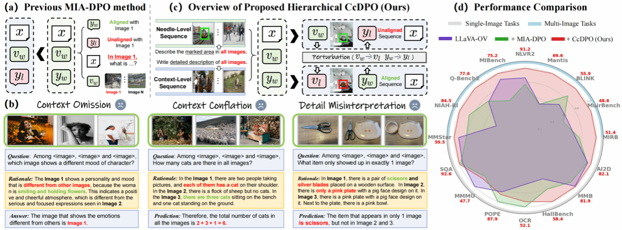 简介:多模态大语言模型(MLLMs)在单图像任务中表现卓越,但在多图像理解方面因跨模态对齐问题而表现不佳,常导致上下文忽略、混淆与误解等幻觉现象。现有基于直接偏好优化(DPO)的方法通常仅针对输入序列中的单张图像进行优化,缺乏对多图像整体上下文的建模,导致效果受限。为此,我们提出“上下文至线索直接偏好优化”(CcDPO),一种层次化偏好优化框架,通过从序列上下文到局部细节的视觉线索聚焦,增强模型在多图像场景下的感知能力。具体而言,CcDPO包含两个层次:(i)上下文级优化:通过引入低成本构建的全局序列偏好对,校正MLLMs在多图像理解中存在的上下文认知偏差。 (ii)线索级优化:通过融合区域视觉提示与多模态偏好监督,引导模型聚焦于关键视觉细节,以抑制其图像感知偏差。此外,为了支持可扩展的优化,我们还构建了自动生成的多层级偏好对数据集MultiScope-42k。实验结果表明,CcDPO 能显著减少MLLM多图像理解中的幻觉现象,同时在各类单图像与多图像任务上均表现出稳定的性能提升。