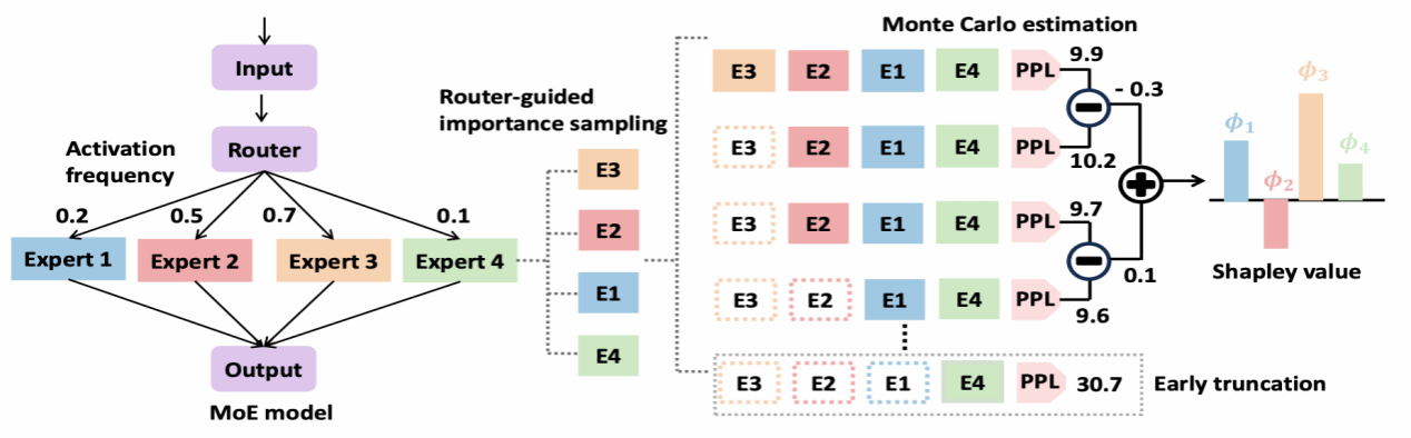 简介:混合专家(MoE)架构能够高效扩展大语言模型,但由于参数规模庞大而面临巨大的内存开销。现有的专家剪枝方法依赖启发式指标或对专家子集进行不可行的穷举评估,导致性能欠佳或缺乏可扩展性。本文提出Shapley-MoE方法,该方法是一种受合作博弈论启发的高效MoE剪枝方法。通过利用 Shapley 值量化每个专家的贡献,无需对专家组合进行穷举评估即可识别重要专家。为克服精确计算 Shapley 值的 NP-hard复杂度难题,本文引入了基于蒙特卡罗采样的高效近似策略,将计算复杂度降低至平方级别。然而,朴素的蒙特卡罗采样仍然面临估计精度不足和采样效率低的问题。为此,本文进一步提出两种新方法以提升采样精度与效率:(1)早期截断,针对过小专家子集引发的不稳定采样步骤进行提前终止;(2)路由器引导的重要性采样,利用门控激活概率优先采样重要的专家子集。理论与实验分析均表明,这两种方法能够加速 Shapley 值估计并提升精度。大量实证评估显示,Shapley-MoE方法优于现有的专家剪枝方法。
