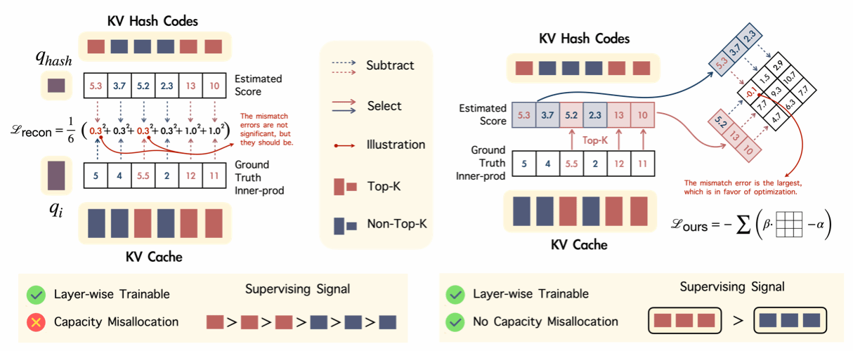 简介:为降低大语言模型中键值缓存(KV cache)的负担以加速推理,一种有效策略是在解码过程中动态选取关键缓存。现有方法多采用随机线性哈希来识别重要词元,但由于模型中查询与键的向量正交分布于两个狭窄的锥形区域内,此方法的效率并不高。我们为此引入一种名为“Spotlight Attention”的新方法,它通过非线性哈希函数来优化查询和键的嵌入式分布,进而提升编码效率与稳健性。同时,我们开发了一套基于布拉德利-特里排序损失的轻量级稳定训练框架,仅需8小时即可在单张16GB显存的GPU上完成非线性哈希模块的优化。实验结果表明,与传统线性哈希相比,Spotlight Attention在大幅提升检索精度的同时,将哈希码长度缩短了至少五倍。最后,我们通过实现专门的CUDA核心来利用位运算的计算优势,在单块A100 GPU上实现了对512K词元的哈希检索耗时低于100微秒,端到端吞吐量相较于传统解码方式提升高达三倍。