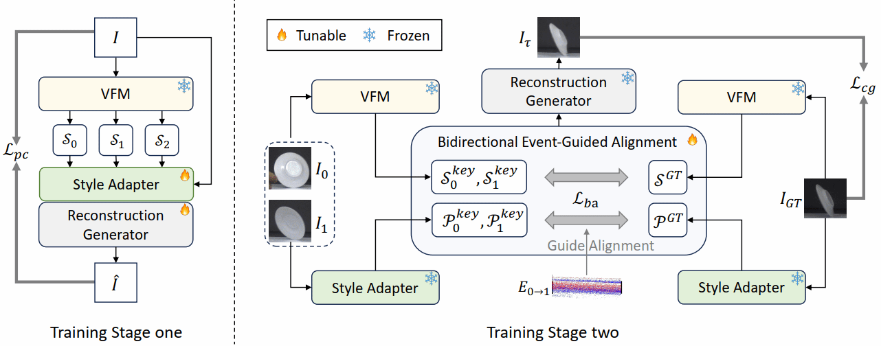 简介:针对基于事件的视频插帧在高速运动场景中,因关键帧模糊、失真等退化而导致生成质量不佳的核心挑战,本文提出了一种名为EPA的新框架。EPA创新性地摒弃了传统的像素级监督学习,转而采用一种在对图像退化不敏感的“语义-感知”特征空间中进行对齐和学习的新范式。该框架借助视觉基础模型提取鲁棒的语义特征,并通过一个双向事件引导模块,利用事件数据的高时间分辨率优势来精确对齐这些特征,最终生成在人类感知上更为真实、清晰的插入帧,并在多个数据集上的大量实验证明了该方法的优越性。