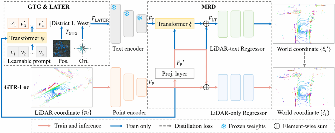 简介:本文提出了一种名为 GTR-Loc 的新型激光雷达定位框架,旨在解决因不同场景几何特征相似而导致的定位歧义性难题。该方法创新地引入地理空间文本(位置和方向描述)作为一种正则化手段,以独特的文本线索消除歧义,从而提升定位精度。此外,本文还提出了一种模态削减蒸馏策略,将文本知识迁移到定位模型中,使得模型在推理阶段无需文本输入,仅依靠激光雷达也可实现高性能定位。实验证明,该方法在多个户外大规模数据集上的表现显著优于当前最先进的定位方法。